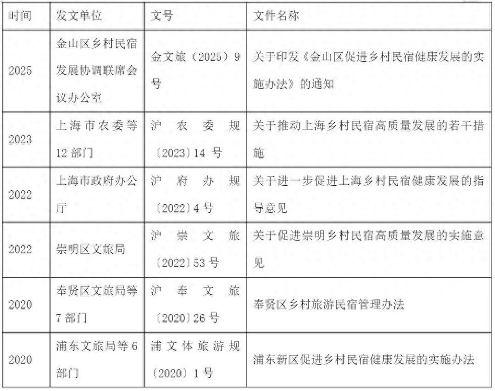 2020年,浦东和奉贤两个区的文旅局分别会同其他相关部门出台了促进乡村民宿健康发展和管理方面的政策文件。随后,2022年3月,上海市政府办公厅出台了促进乡村民宿健康发展的相关指导意见;10月,崇明区文旅局第一个出台了促进乡村民宿高质量发展的政策文件。2023年,上海市农委会同其他相关的11个部门颁布了推动乡村民宿高质量发展的系列措施。2025年金山区乡村民宿发展协调联席会议办公室颁布了民宿健康发展的实施办法。从政策目标看,上海乡村民宿的定位已从“解决农民增收”升级为“繁荣农村经济+提供高品质旅游体验”双重导向,逐步转向“宜居、宜业、宜游的美丽乡村”建设。