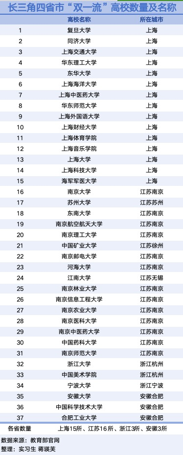 21世纪经济报道梳理发现,在第二轮“双一流”建设高校及建设学科名单中,长三角共有37所高校入选,占目前“双一流”高校数量的四分之一,其中上海有15所,江苏有16所,浙江有3所,安徽有3所。